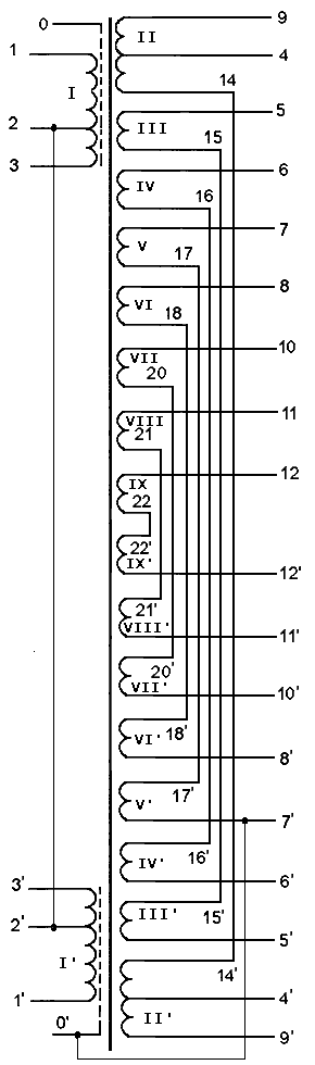- Обмотка 9-9' (9-19+19'-9') содержит всего 6 (3+3) витков, соответственно полное номинальное напряжение всей обмотки равно 2,2 вольта.