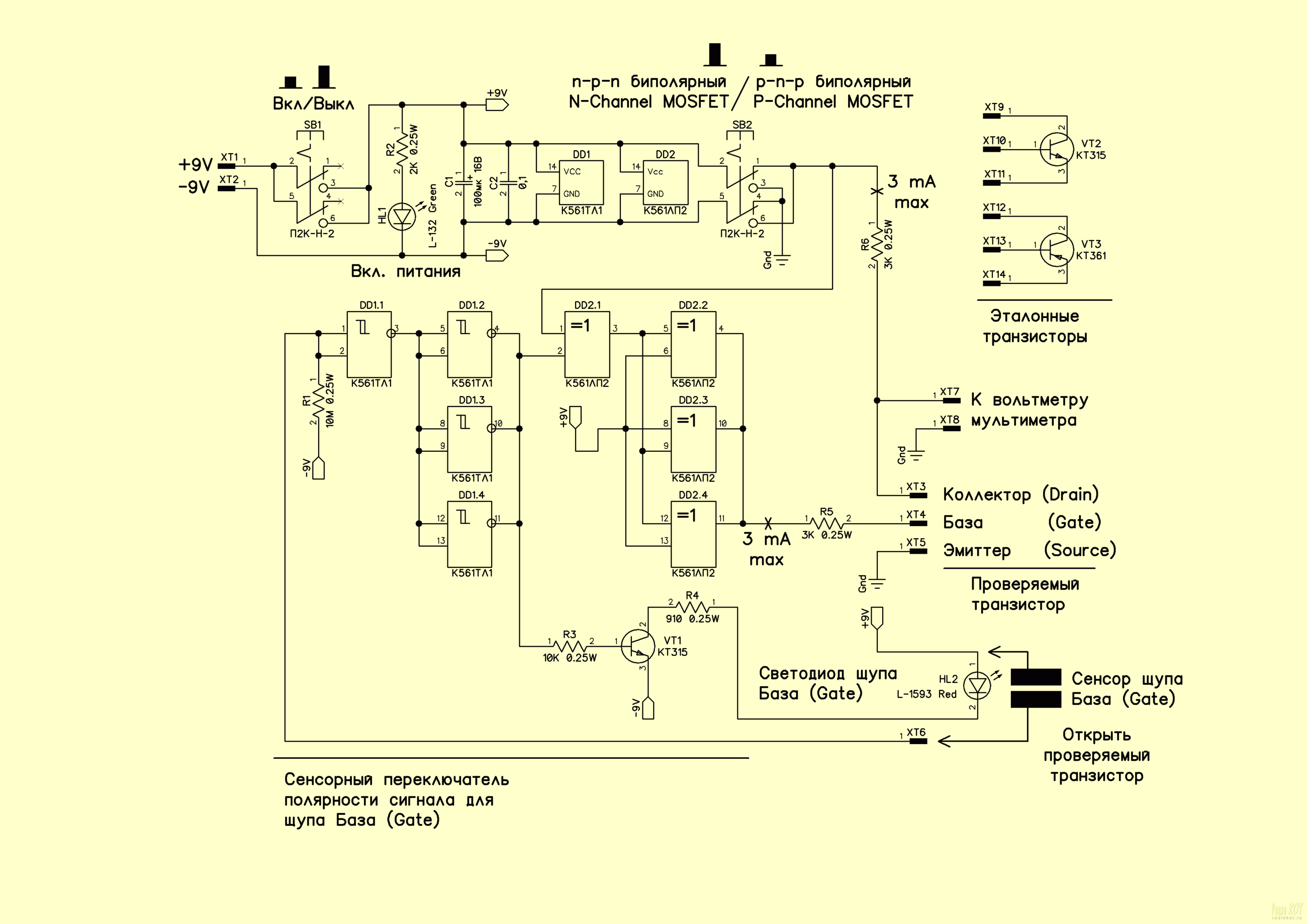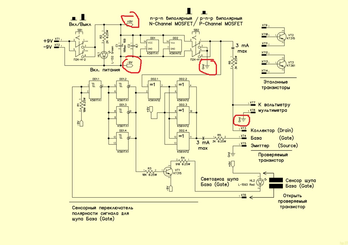 Полярность меняется здесь только на щупах переключателем SB2 при проверке транзисторов разных типов проводимости.