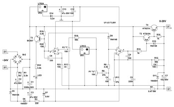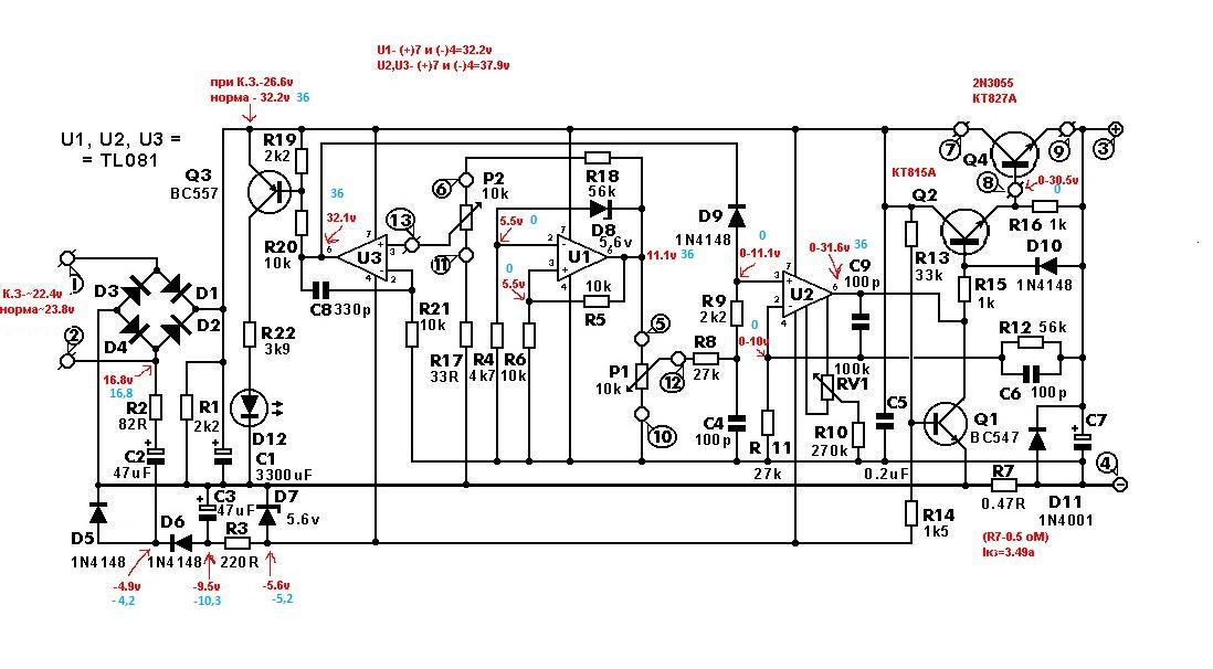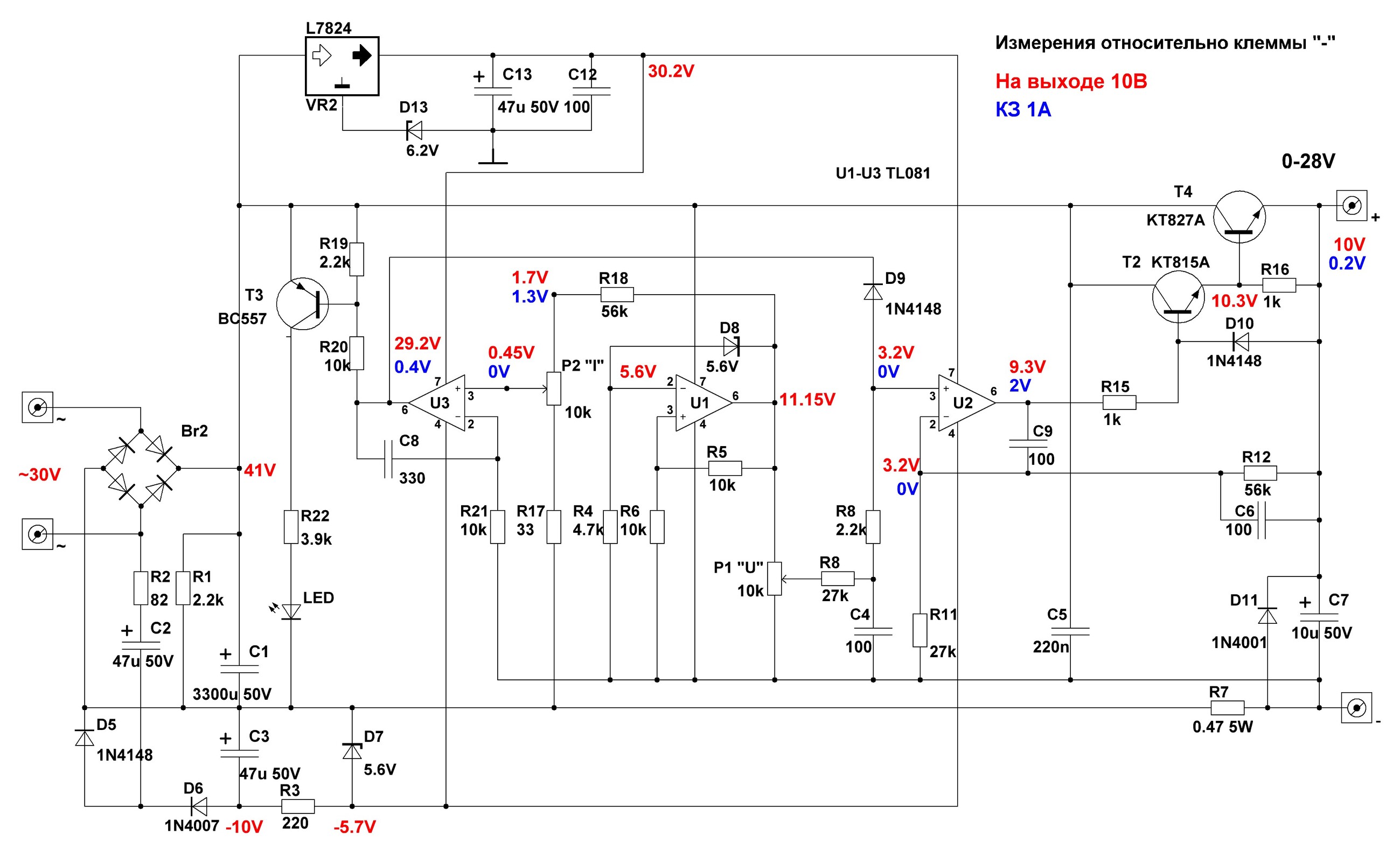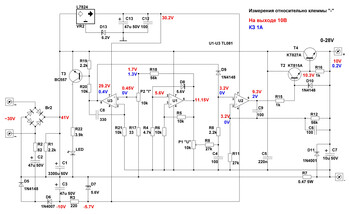 | 46В постоянки для TL081 много. У меня в одном БП постоянка на ХХ 44В было, ТЛки грелись иногда выходили из строя потом как уже писал сделал стаб. питание для двух ОУ. Предлагают ставить вместо TL081 МС33171, но у нас я их не нашел. Если нужно 0-30В на выходе то 30В + 20% на просадку = 36В, 36В / 1.41 = 26В переменки. Настраивать там нечего, правильно собранная плата на рабочих деталях заработает сразу.